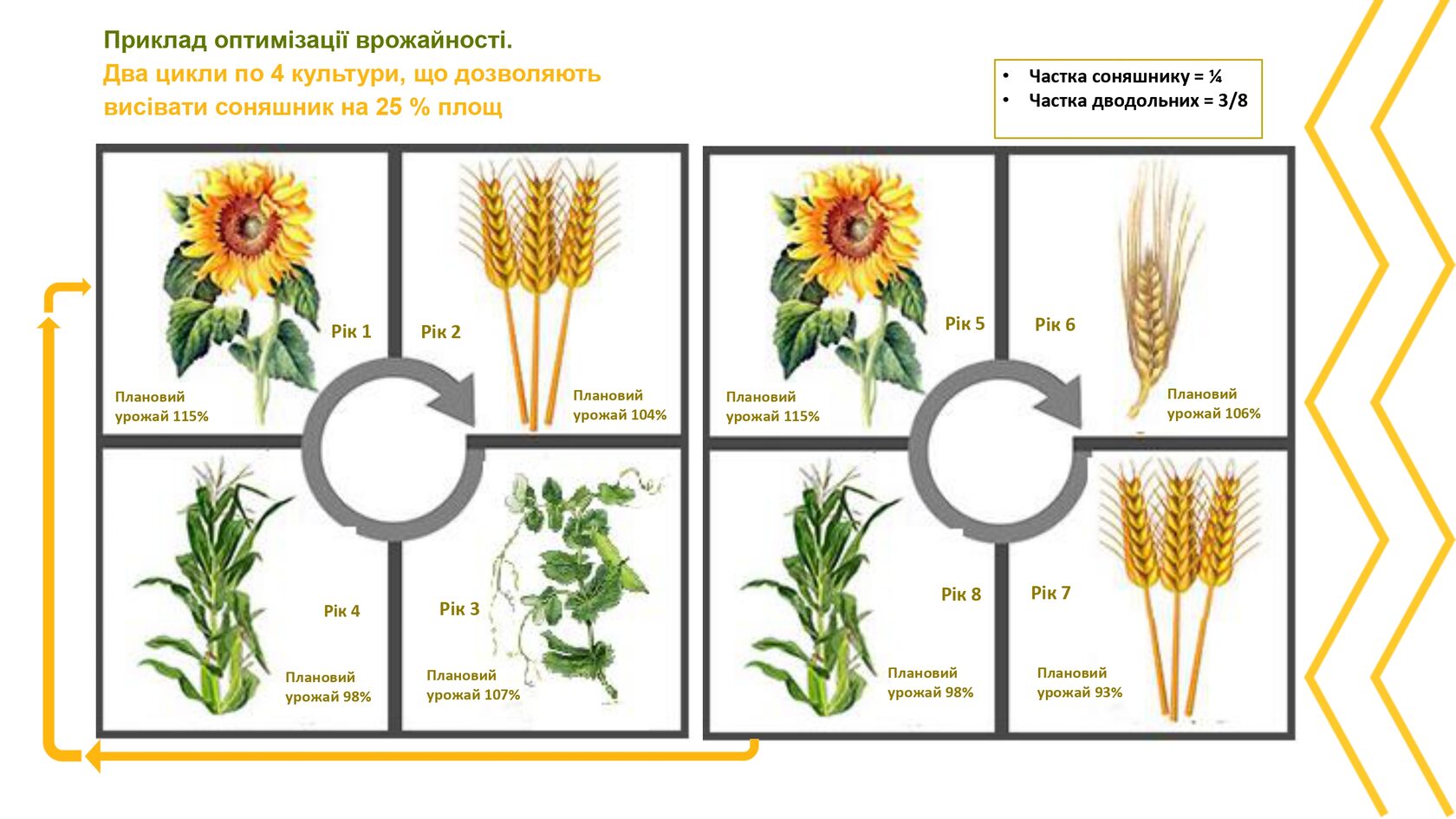 Також він зауважив, що ефективно можна вирощувати соняшник у довгостроковій перспективі, а дворічна ротація нераціональна. У якості прикладу оптимізації врожайності він привів таку схему: два цикли по 4 культури, що дозволяють висівати соняшник на 25% площ.