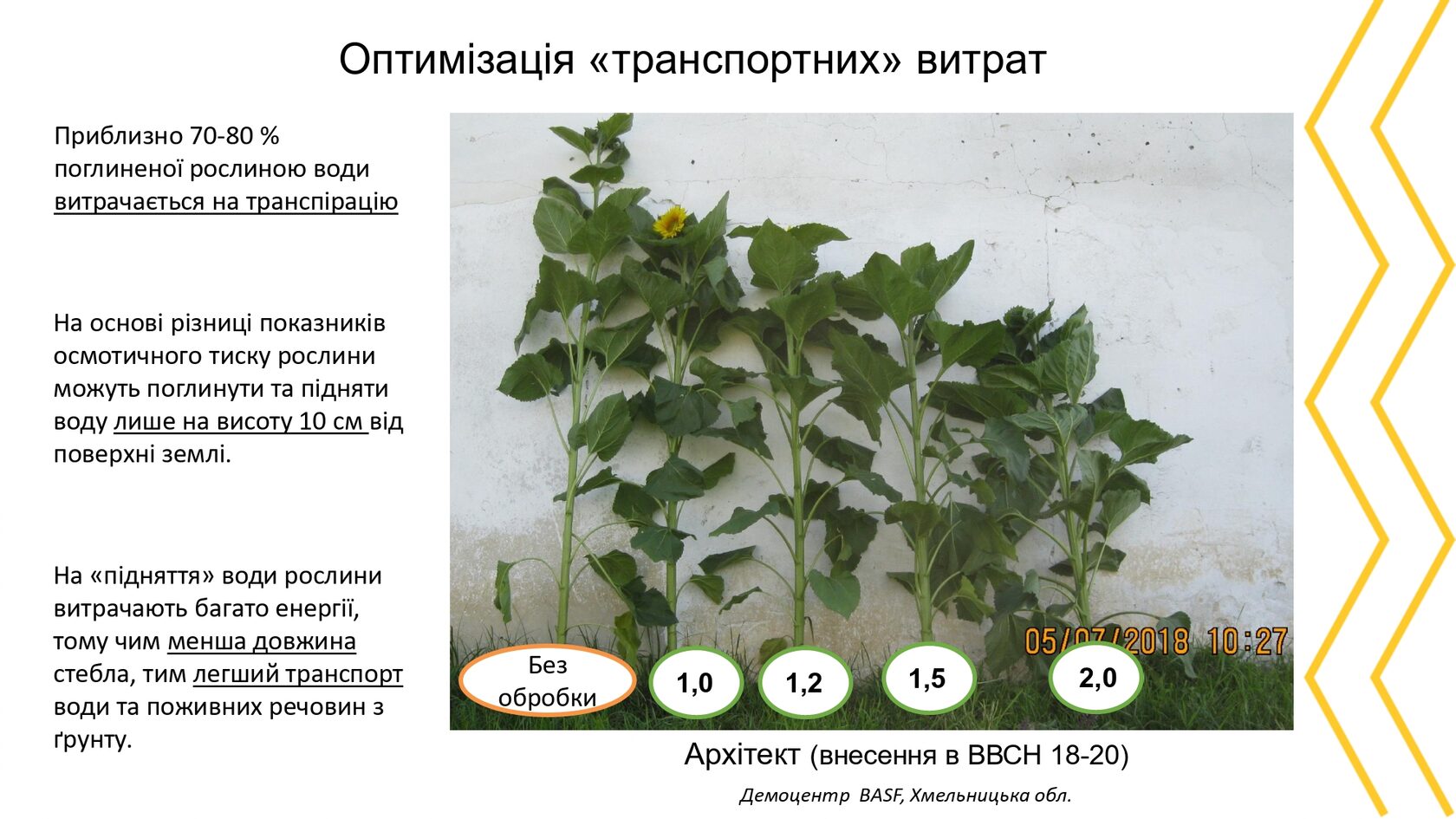 «Самий важливий компонент – це оптимізація транспортних витрат. Приблизно 70-80% поглиненої рослиною води витрачається на транспірацію – охолодження рослинного організму, доставку поживних речовин саме в місця їх потреби. І цей процес достатньо енергозатратиний. Завдяки осмосу рослина може підняти воду лише на висоту 10 см від поверхні землі. На іншу висоту працюються транспіраційні насоси, тобто за рахунок випаровування. Це дуже складний і енергозатратний процес. На підняття води рослини витрачають багато енергії. Тому чим нижча довжина стебла, тим легший транспорт води і поживних речовин з ґрунту», – пояснив виробник і показав, як на висоту соняшника впливає внесення архітекту.