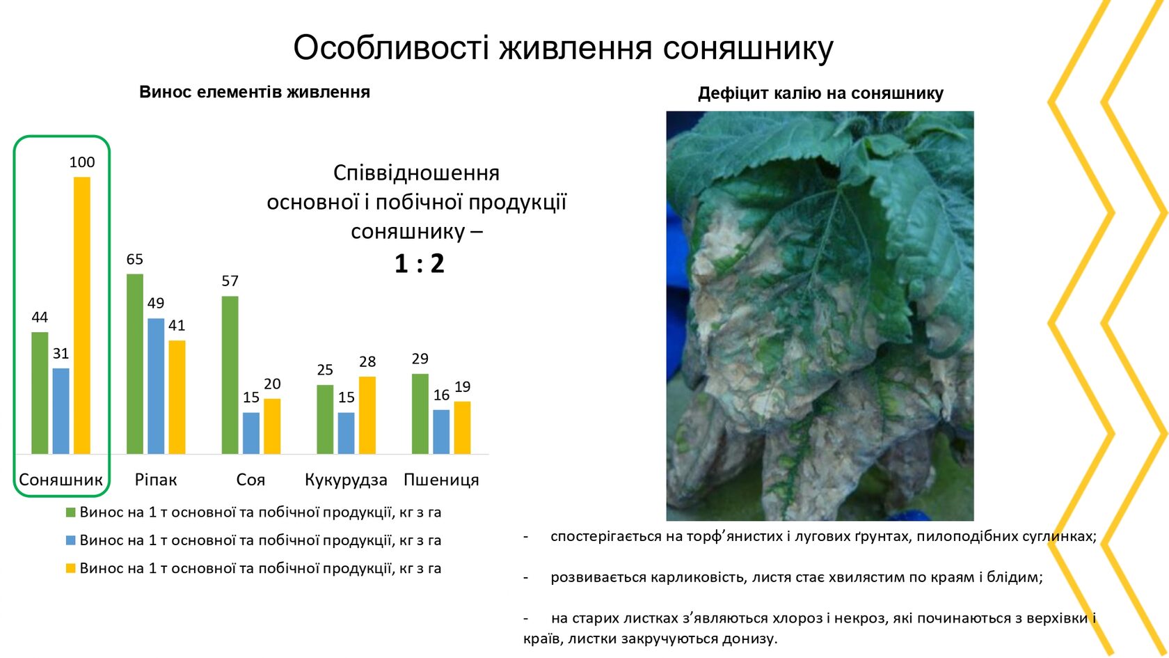 Далі Сергій розповів про особливості живлення соняшнику. Так, він повідомив, що для того, щоб сформувати 1 тону основної та побічної продукції соняшнику потрібно 44 кг азоту. При цьому співвідношення має бути 1:2. Тобто, щоб отримати 1 т основної продукції потрібно сформувати агроценоз, у якому загальна маса буде складати 3 т. При цьому калію взагалі будуть потрібні захмарні кількості.