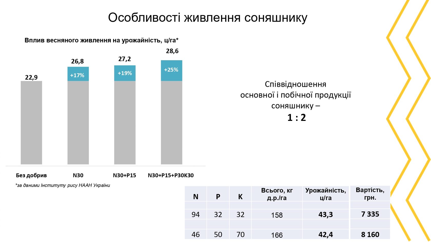 За результатами аналізу виробники зробили висновок, що в цілому тенденція, щоб оптимізувати азотне живлення соняшнику присутня. Для того, щоб зрозуміти, як соняшник відгукується на азот, спікер привів результати дослідження інституту рису щодо впливу весняного живлення на урожайність.